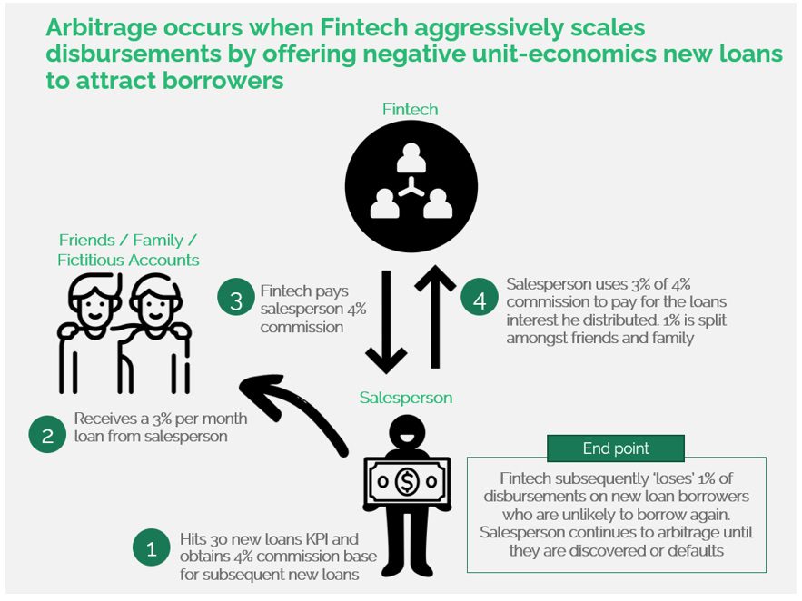 To mitigate the risk of salesperson fraud and loan arbitrage, companies can adjust their incentive structures to align with non-performing loan (NPL) targets and tie commissions to successful repayment.