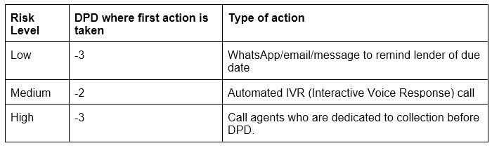 The lending startup categorizes lenders by their risk level (Low, Medium, High) and applies different interactions for maximized effort before the day past due (DPD).